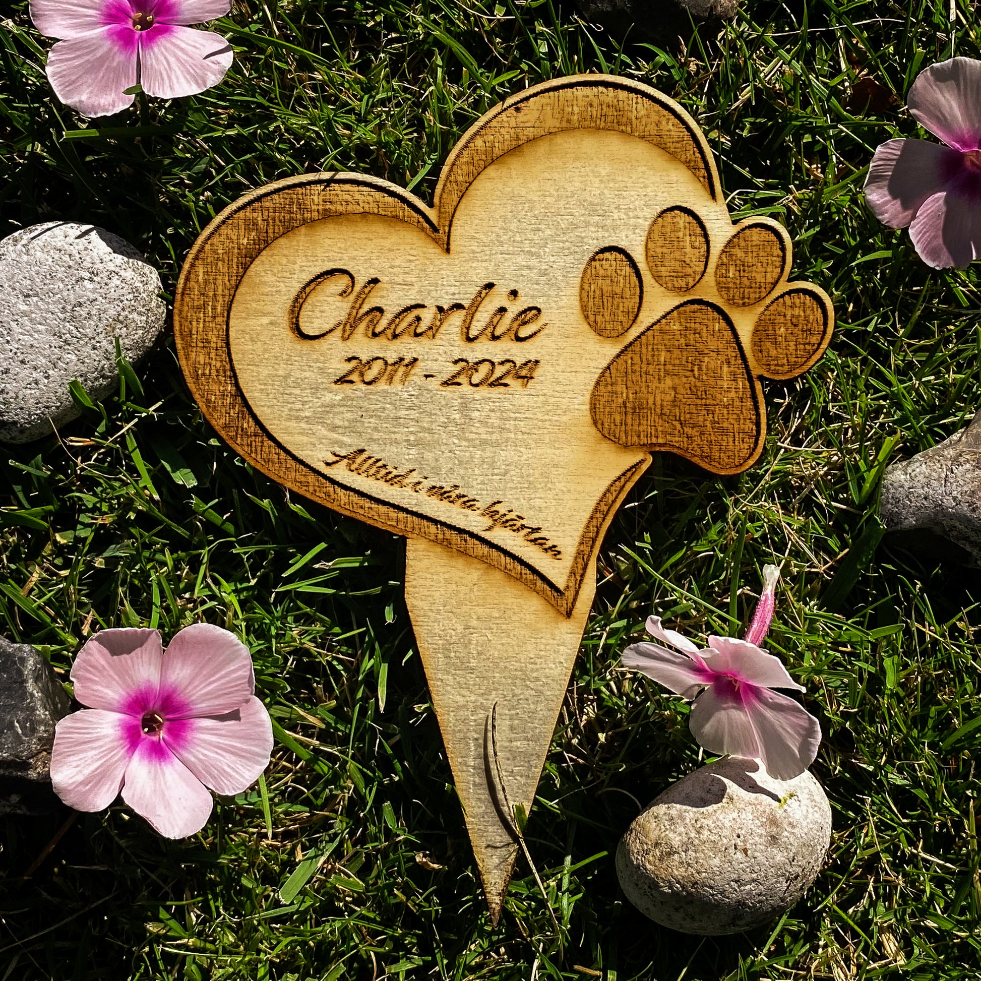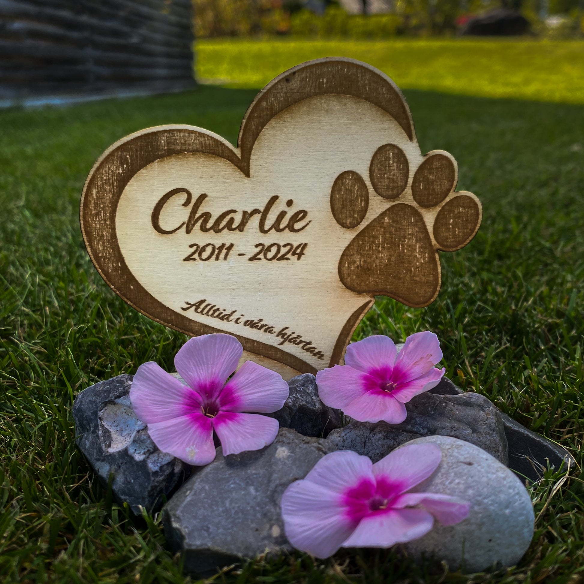 Denna minnesskylt är ett fint och varaktigt sätt att minnas ditt husdjur, samtidigt som den smälter väl in i naturen med sin diskreta och eleganta design. Varje skylt är unik och graverad med omsorg för att skapa ett personligt och meningsfullt minne.