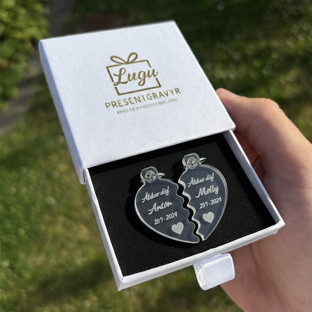 Vill du visa lite extra kärlek till någon som förtjänar det? Då har vi en stilren nyckelring med format som ett hjärta i 2 delar som passar mot varandra.