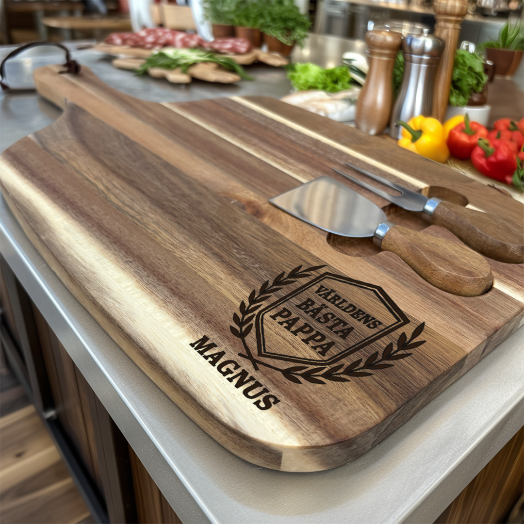 Denna charkbricka är den perfekta presenten till någon du tycker om – en gåva som kombinerar nytta med känsla. Med en personlig gravyr blir den ett minne för livet, oavsett om det är till en födelsedag, inflyttning eller bara för att visa uppskattning. En unik och omtänksam present som garanterat blir uppskattad i köket.